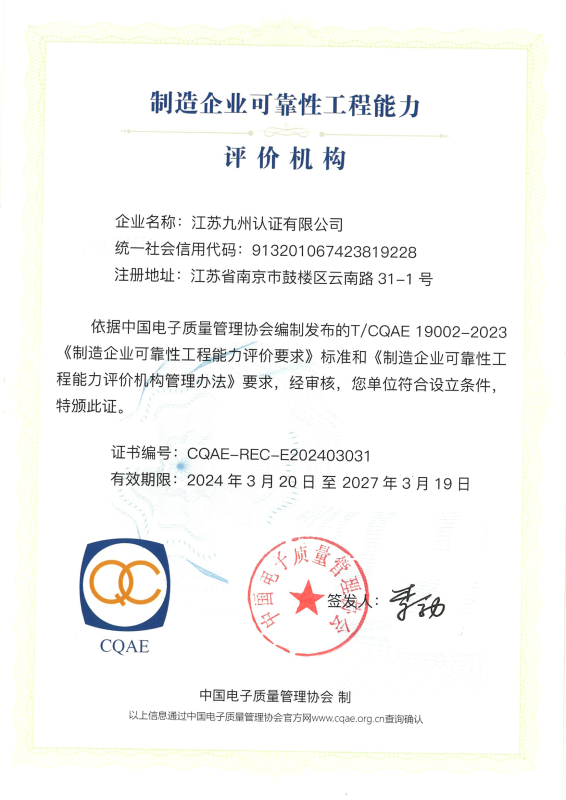 制造企業(yè)可靠性工程能力評(píng)價(jià)機(jī)構(gòu)證書